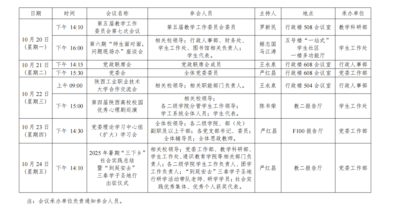 西安交通大学城市学院2025-2026学年第一学期第7周(2025年10月20日至2025年10月26日)主要会议安排