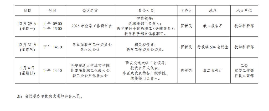 西安交通大学城市学院2025-2026学年第一学期第17周(2025年12月29日至2026年1月4日)主要会议安排
