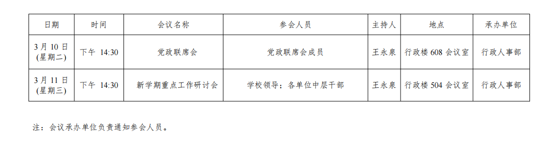 西安交通大学城市学院2025-2026学年第二学期第1周(2026年3月9日至2026年3月15日)主要会议安排