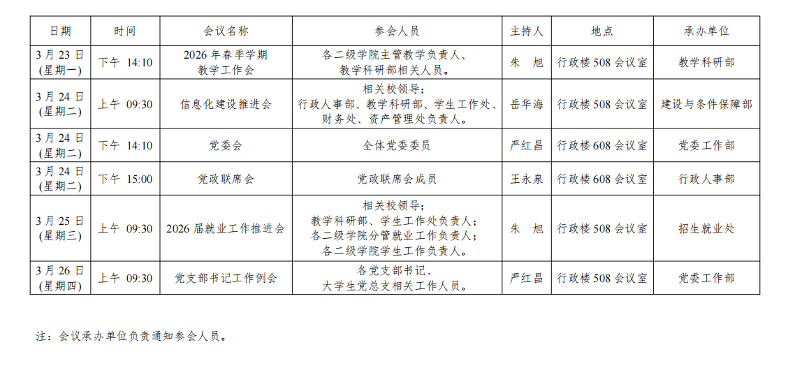 西安交通大学城市学院2025-2026学年第二学期第3周(2026年3月23日至2026年3月29日)主要会议安排