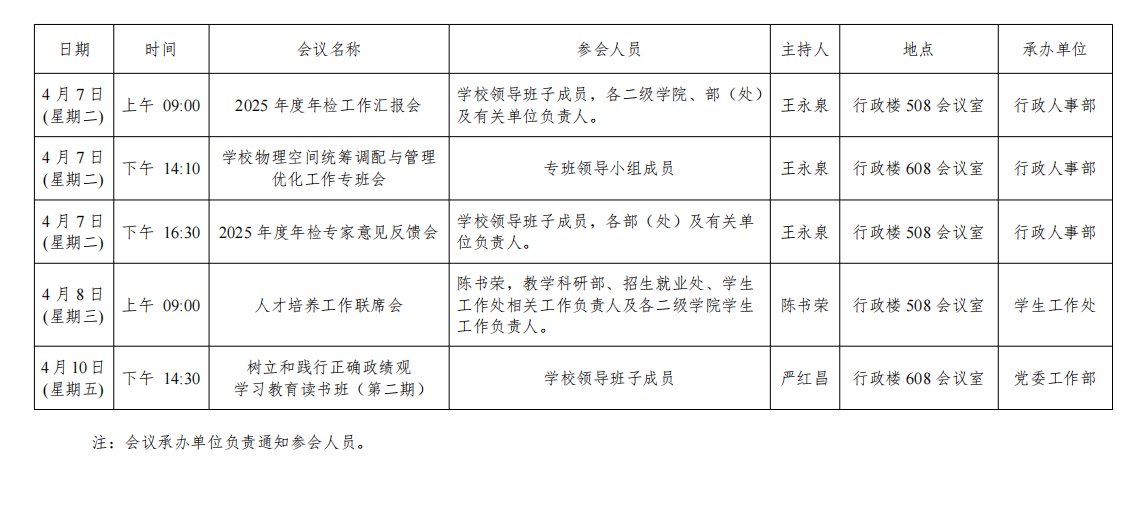 西安交通大学城市学院2025-2026学年第二学期第5周(2026年4月6日至2026年4月12日)主要会议安排