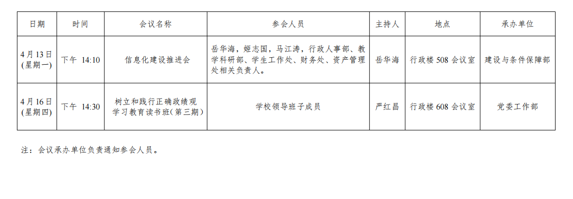 西安交通大学城市学院2025-2026学年第二学期第6周(2026年4月13日至2026年4月19日)主要会议安排