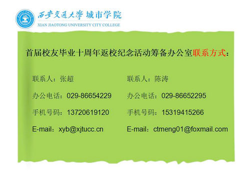 时光荏苒,岁月如歌。渭水一别,已匆匆十年,你们上下求索,品尝着生活的酸甜苦辣和世间的人情冷暖。多少往事伴随着岁月的流失,在你们的记忆里慢慢淡化。但我们坚信:大学四年间,那些过去的往事,让你我魂牵梦萦;那些熟悉的面孔,让你我倍感亲切;那些纯真的感情,让你我回味无穷。在这里,我们用短短的四年时光演绎了太多的青春故事,让我们无法割舍。