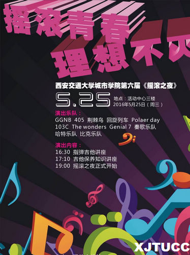 团委将于2016年5月25日晚7:00在大学生活动中心举办2016年陕西省大学生乐队巡演暨西安交通大学城市学院第六届《摇滚之夜》音乐晚会,届时欢迎各位领导、老师及全体同学们莅临观看指导!