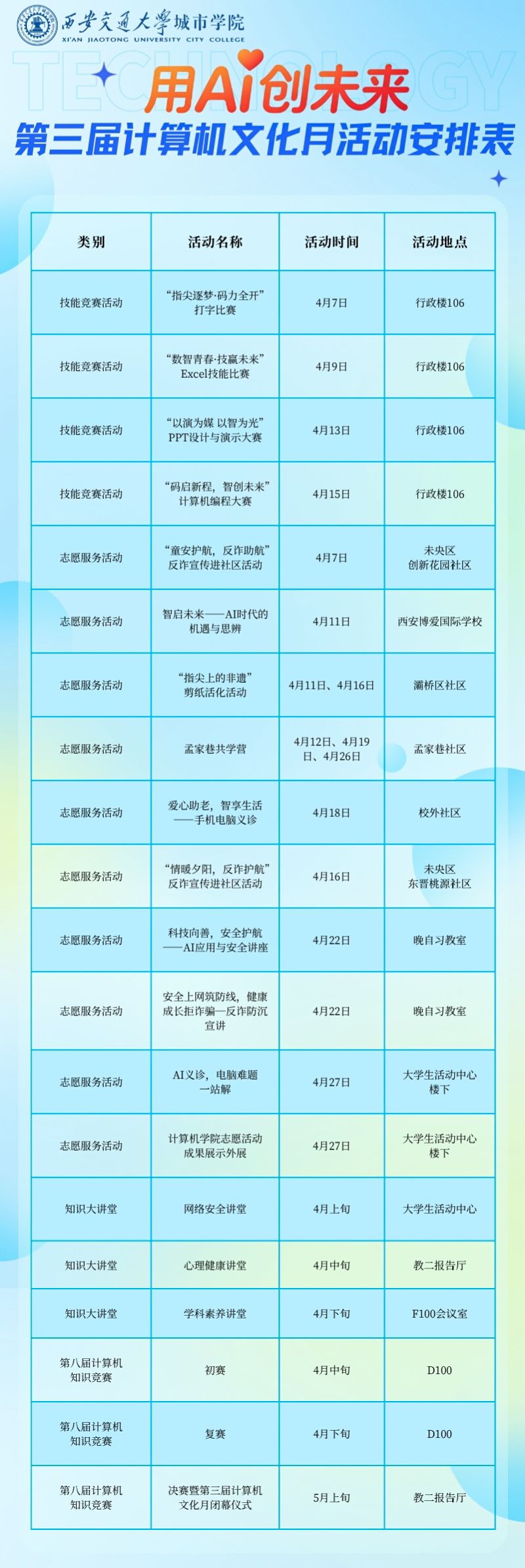 为深化学生对计算机专业知识的理解,激发探索计算机软硬件、人工智能等领域的热情,普及AI应用与创新思维,搭建交流学习、实践展示的优质平台,计算机学院定于2026年4月举办“用AI创未来”第三届计算机文化月系列活动。本次活动围绕专业技能提升、志愿服务实践、知识素养培育、综合能力比拼四大板块展开,具体报名请关注“西安交通大学城市学院计算机学院”微信公众号,现将安排通知如下: