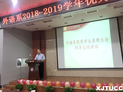 为奖励先进、树立典型,表彰在学习、学科竞赛、文体活动、创新创业等各个方面表现突出学生,西安交通大学城市学院外语系于6月20日在F100报告厅举办2018-2019学年优秀学生表彰大会。出席本次大会的嘉宾有外语系副主任赵永生副教授、外语系英语类教研室主任徐素云、英语类教研室副主任张慧、外语系学工办老师及外语系2017级、2018级全体学生。