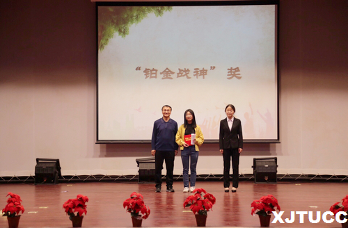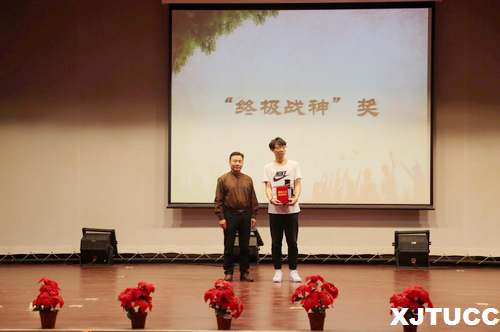 王淇同学获得“终极战神”称号,由学生服务中心主任张学堂老师为其颁发证书和榨汁机一台。