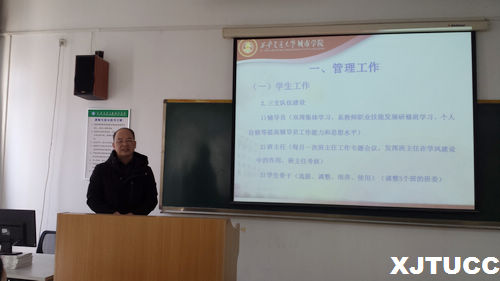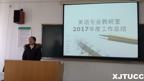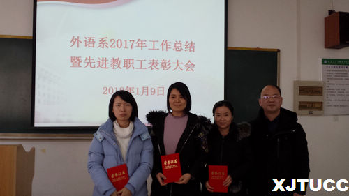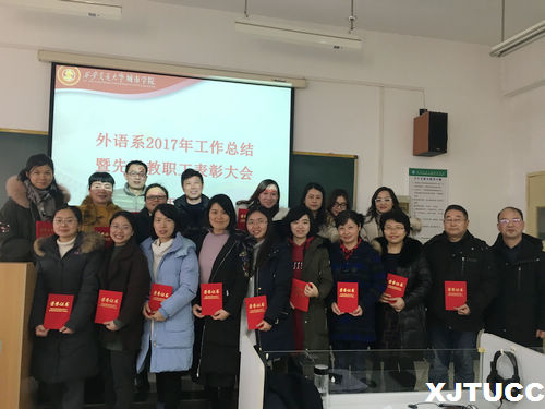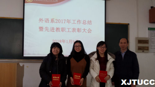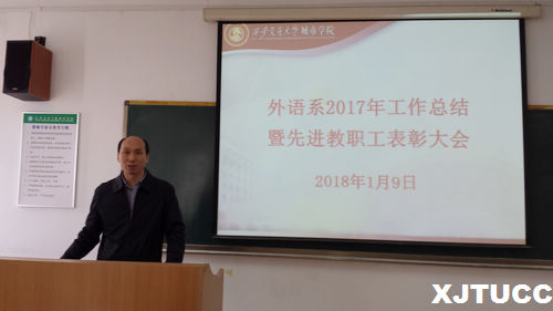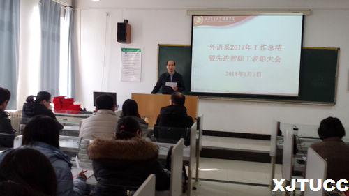 1月9日下午,西安交大城市学院外语系在教学楼B307教室召开了由全系教职工参加的2017年工作总结暨先进教职工表彰大会。外语系常务副主任韩红建副教授、副主任赵永生副教授作外语系2017年工作总结报告,外语系主任助理、教研室主任和学工办负责人分别作述职报告。