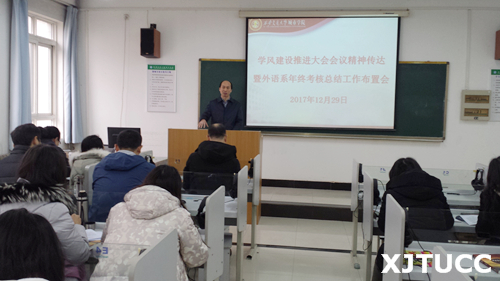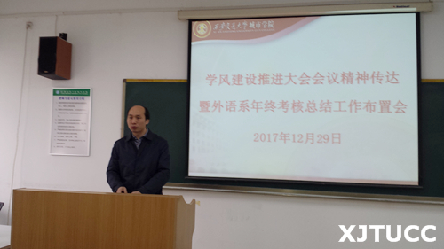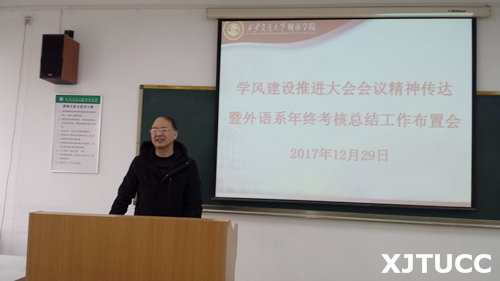 12月29日下午,西安交大城市学院外语系在教学楼B307教室召开全系大会,外语系常务副主任韩红建副教授传达学院学风建设推进大会会议精神,并布置外语系年终考核和总结工作会,外语系副主任赵永生副教授主持会议。