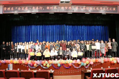 管理系于11月30日晚在教二报告厅举办“全室爱.青春行,新时代.新梦想”为主题的第三届宿舍文化节文艺汇演,莅临本次大会的嘉宾老师有:管理系常务副主任冀祥,管理系学生工作主管刘健,经济系团工委书记叶超,管理系团学专项负责人吴江菊,管理系学工办老师李玉婷,张婷婷,张德馨,韩珺,李辉,姚赞,赵杰。本次汇演以九人舞蹈“大鱼”拉开帷幕,夺目的红色舞裙为舞台染上了浓厚的古风气息,美轮美奂的舞步与荡气回肠的音乐营造了整场演出的良好氛围。纵观整场晚会,“源于生活高于生活”始终是演员们所追寻的境界。有“男生宿舍”表现的生活中日常里点滴间的幽默风趣;有“感恩的心”里涌动的岁月中细水长流的感激与触动和“背影”描绘的青春与梦想。小品“传销组织”对社会黑暗现象的批判与讽刺和“放飞中国梦”对生活中暖风旭日的歌颂与赞美形成了鲜明的对比。在歌曲“国家”的歌唱中,同学们以饱满的对中华民族的荣耀与自豪宣告了此次汇演的圆满成功。最后,冀祥老师进行大会总结。冀老师对本次宿舍文化节系列活动充满正能量,正确弘扬了党的十九大精神进行了赞赏,并借此机会向同学们宣布了物流管理专业荣获“百蝶杯”第三届全国大学生物流仿真设计大赛一等奖的好消息。他给予管理系学生高度的评价及鼓励,希望以后的管理系能不断进步,不断发展,再创辉煌!