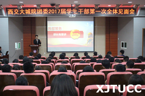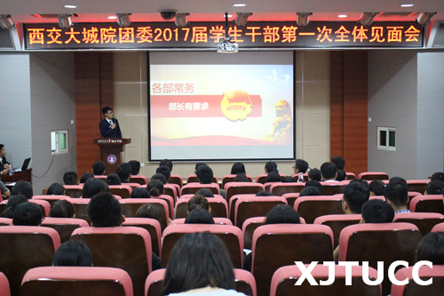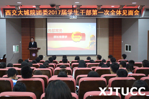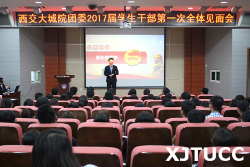 9月18日中午,西安交大城院团委2017届学生干部第一次全体见面会在F100举行,莅临本次会议的嘉宾有:团委书记吴昊翔,团委韩树、茹静和丁义伟老师,本次会议由团委办公室杨峰同学主持。