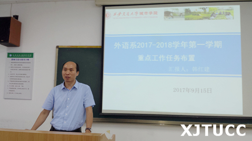 9月15日下午,西安交通大学城市学院外语系在教学楼B307教室召开全系教职工大会,安排布置本学期重点工作任务。外语系常务副主任韩红建副教授主持并作主题发言。