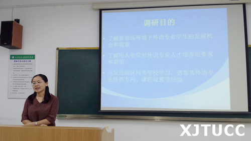 最后,英语专业和商务英语专业教研室主任徐素云老师向大家汇报了外语系领导、专业教研室主任、语言实验室人员一行4人,利用暑期赴武汉、广州开展教学调研的收获和感受。在走访了武汉一家公司、广州中山大学新华学院以及三家用人单位以后,大家了解到外语人才广泛的就业前景,互联网+模态下的外语教学模式,先进的实验设备和齐全的教学软件,校企合作灵活培养实用型人才模式等,并从中得到启发,受益匪浅。