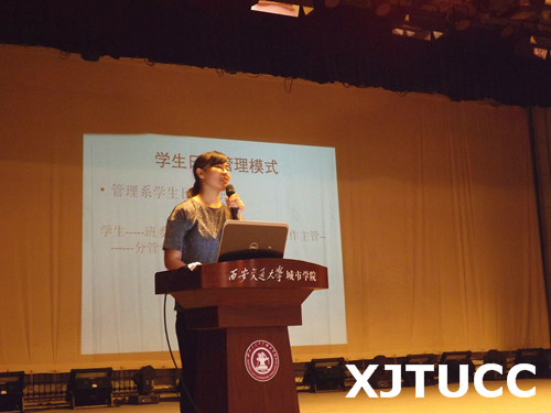 最后,韩珺老师为大家讲解了团学方面的相关内容。韩老师向同学们介绍了管理系团学组织部门结构以及系内品牌活动,她鼓励大家多多参与实践活动,转变自己的身份及思想,紧跟“大众创业、万众创新”政策。希望同学们能积极地加入到团学组织中来,展示出自己的才华与激情,在大学四年中能够有所锻炼,有所提升。