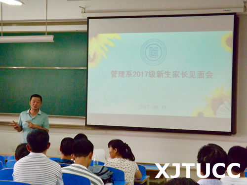 8月19日下午,西安交通大学城市学院管理系2017级新生家长见面会在教2-213召开。管理系常务副主任冀祥、学生工作主管刘健、主任助理解茹玉、团工委书记韩珺、系办公室姜泽等领导和老师出席见面会。