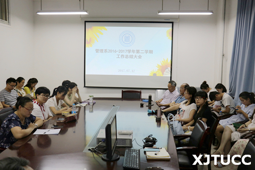 7月12日,管理系在教二225室召开本学期工作总结大会,主任卫民堂老师、常务副主任冀祥老师、副主任郭关科老师、首席教授王海民老师以及各教研室老师、学生工作办公室老师,会议由冀祥老师主持。
