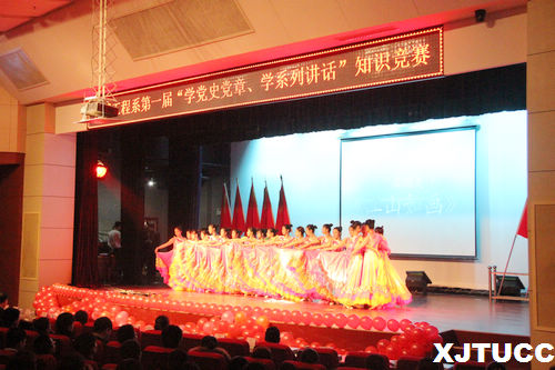 大会伊始,全体起立迎党旗、奏国际歌,由霍伟森老师带领全体党员重温入党誓词。随后主持人介绍了比赛的形式规则及参赛选手,此次大赛由必答题、抢答题、论述题、巅峰对决四个环节组成,各参赛队伍由各年级优秀学生代表组成。比赛中,选手们将自己对党章党史的认识以多种形式展现出来,在最终巅峰对决中参赛选手们以演讲的方式阐述了当代大学生对党性意识的贯彻与落实,他们的精彩表现博得了台下观众的阵阵掌声。比赛间歇,由大学生艺术团精心准备的歌舞节目《江山如画》表达了对祖国大好河山的赞美,抒发了对党和国家的热爱。