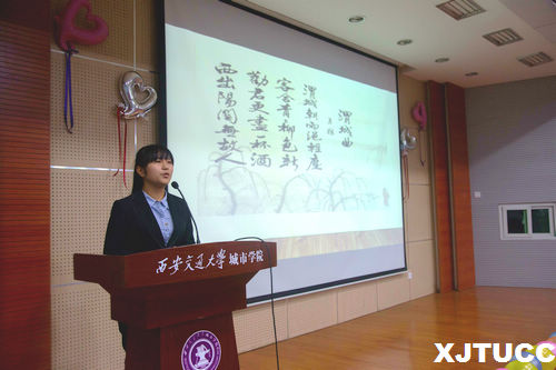 本次演讲比赛由刘方舟和赵凎楠同学主持,在一段精彩的开场舞表演过后,本场演讲比赛正式拉开帷幕。主持人介绍了此次演讲比赛的评委老师,并向大家宣读了比赛规则及评分标准。比赛第一环节七位参赛选手依次进行了形式多样的自我介绍与才艺展示,吉他弹唱、深情朗诵、相声互动赢得了同学们热烈的鼓掌及欢呼。本次演讲比赛还开通了微信公众投票平台,同学们可以为自己喜欢的选手投票。接着是来自几个不同省份的同学带来了的串场节目——“三句半”,夸张烦人表演形式引得同学们捧腹大笑。比赛第二环节由评委老师抽签决定选手的演讲顺序,选手们通过精美的PPT向评委介绍了别人眼中不一样的家乡,让大家了解到祖国的美景美食、名人古迹等。最后由主持人赵凎楠等同学带来的吉他弹唱将现场的气氛带入了高潮。