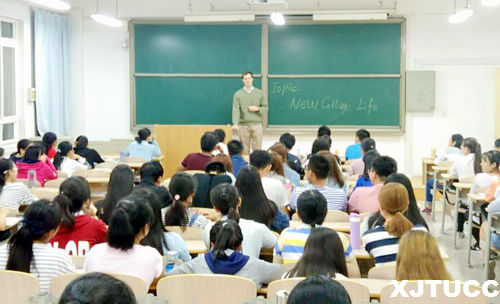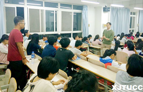 Michael和同学们就“语言学习的优势?外语专业学生在国内外工作的不同?如何安排自己的空闲时间?语言学习的方式方法?中国学生和美国学生学习方法的不同?”等问题进行互动。在聊到如何安排空闲时间时,Michael讲他学习中国功夫,还现场为同学们表演了拳法,引起全场轰动。最后,外教Michael建议同学们多看英语电视,多听英文歌,提高听力和口语表达能力。