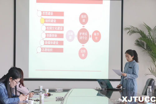 首先,各系团工委书记进行工作展示。外语与人文社科系团工委书记樊超,以"在思考中前行"开始,着重介绍了"外国语言文化论坛"、"金秋外语文化节系列外语教学活动"及"英文辩论队"三个主要特色活动。护理系团工委书记汪成鸿展示了本系"一系一品"第三届健康知识大赛以及护士节健康义诊活动成果,学生积极参与,获益良多。计算机系团工委书记于从聪将其团学工作理念总结为"一个中心、两个方面、三个能力",介绍了计算机系科技讲座、演讲比赛、团学交流会三个学术交流活动,同时展示计算机系一支筑梦支教队发展为陕西公益发展中心的卓越成果。随后,管理系团支部书记陈杜昊提出管理系通过"建档案、办讲座、勤指导、多培训"的方式促进学生创新创业。管理系多次跨系联合,通过学科优势互补促进各系共同提高,同时努力打造"轻娱乐、重品牌、增收获、促学风"的团学活动生态,促进学生全面发展。电信系团工委书记张天提出电信系"2+3+2"品牌模式,即电子"兴趣小组与mallab竞赛二创新、电信系历届优秀学子宣传册、榜样墙、信语飞翔三回顾,名师大讲堂、学生讲堂二交流",创新教学成效显著。机械系团工委书记杨耀聪展示了机械系组织学生参加"挑战杯"大学生创业计划竞赛,三支队伍参加"非凡士杯"均荣获得二等奖、第八届大学生节能减排大赛、我院星火杯以及首届机械系创新设计大赛等多项赛事并取得佳绩,同时对未来团学工作提出"五个加强,一个紧跟"的工作计划。经济系开展系列活动,如"头脑风暴--创新创业杯"学科竞赛活动、专业品牌"经济论坛、"奔跑吧,offer"模拟招聘大会,以及脑力品牌"一站到底"知识竞答挑战赛,经济系团工委书记提到在团学工作中她结合本系特点,设定独特的品牌活动以及品牌赛制,效果良好。