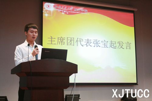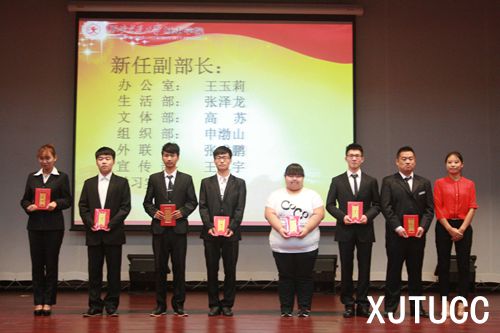 大会第一项,奏唱共青团团歌。接着,主持人宣读上届优秀部长及干事获奖名单,并由汪曦、杨耀聪老师分别为获奖同学颁发荣誉证书。颁奖结束后,由团学会组织部原部长路昊明代表上一届团学干部发言。在对上届团学工作做一总结的同时,路昊明也分享了自己的干部经验。随后,主持人宣读了新任团学干部的聘任名单,由霍伟森、王姣、王丽丽老师分别为新任主席团、部长、副部长颁发聘书,并由新一任团学会主席张宝起进行就职演说。张宝起承诺一定会带领新生力量以最大的热情投入系团学工作,努力营造团学会的“家”文化,努力服务于全系师生。