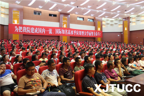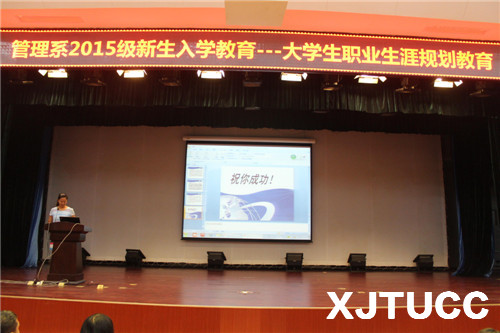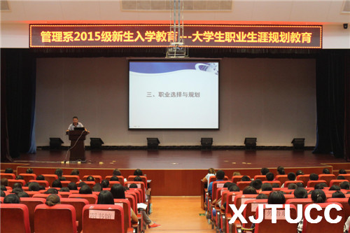 为引导新生更加准确地定位自己,明确发展方向,发掘自身潜能,西安交大城市学院管理系于2015年8月29日下午14:00在教二报告厅举行2015级新生入学教育之大学生职业生涯规划教育。本次活动由管理系副主任王小青主讲、学生工作主管刘健主持。另外参加本次活动的还有团工委书记朱艳丽、新生辅导员李汀、刘虎、张德馨以及管理系2015级全体新生。