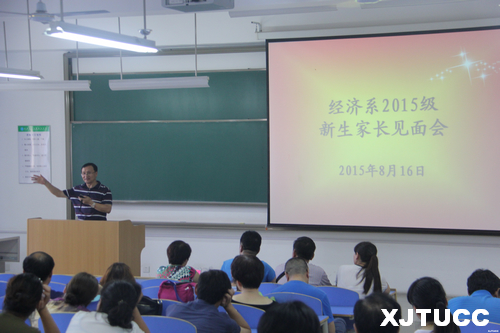 西安交通大学城市学院经济系于8月16日下午3时,在教2-213教室召开了2015级新生家长见面,经济系主任杨健全、副主任史冬梅、办公室主任刘加宁以及学生工作主管刘静参加了见面会,见面会由金融141班赵博文同学主持。