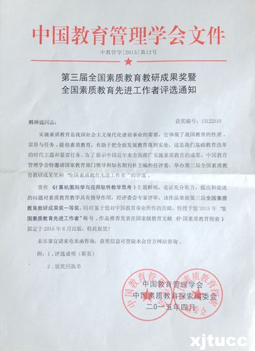 由中国教育管理学会主办的第三届全国素质教育教研成果奖暨全国素质教育先进工作者评选活动圆满结束。西安交通大学城市学院艺术系动画教研室韩仲远老师在《网友世界》上发表的文章《计算机图形学与应用软件教学思考》,经评委会专家评审,认为其主题鲜明,论证充分有力,提出和论述的问题对素质教育教学具有指导作用。经评委会评审,该作品荣获“第三届全国素质教育科研成果奖一等奖”。同时,韩仲远老师也因对中国素质教育所做出的贡献,被评授予2015年“全国素质教育先进工作者”称号。《计算机图形学与应用软件教学思考》被推荐发表在国家级教育文献《中国素质教育探索》中。