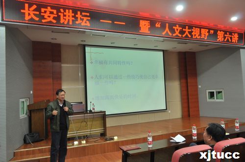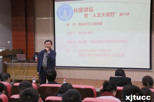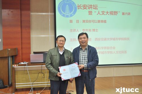 2014年11月5日晚7时,由陕西省社会科学界联合会及西安交通大学城市学院人文社科系联合主办的“长安讲坛——暨‘人文大视野’第六讲”在教学D楼F100教室顺利举行。讲座由李齐光博士担任主讲。院长陈光德、教学中心副主任刘金安、人文社科系副主任史宪政、院心理学教师以及人文社科系相关教师参加了讲座。本次讲座由院长陈光德教授主持。