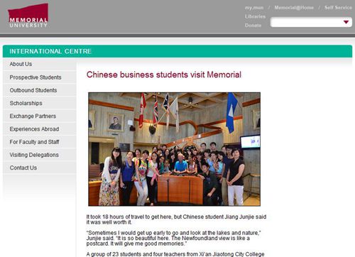 近日,加拿大纽芬兰纪念大学国际中心官方网页发表题为《Chinese business students visit Memorial(中国商科学生访问纪念大学)》的西安交通大学城市学院“全球商务暑期”班师生采访报道。