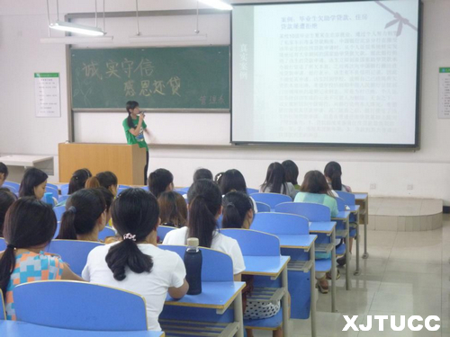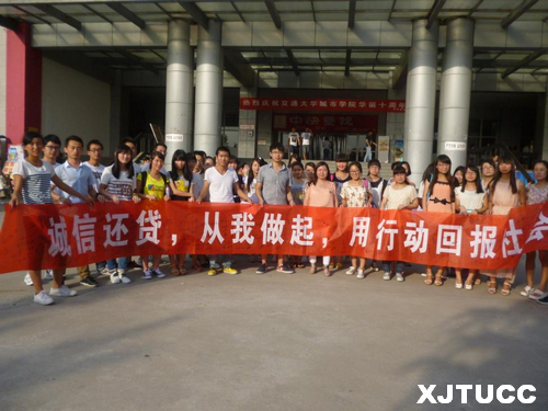 为了配合学院做好生源地助学贷款工作,进一步增强学生诚信还贷意识和社会责任感,西安交大城市学院管理系于6月11、12日开展学生诚信还贷系列教育活动。本次系列活动分为室外宣传和室内教育两部分。6月11日,管理系所有申请助学贷款学生按年级分别于中午和晚上在中快餐厅楼下进行诚信还贷倡议,陈相君老师组织贷款学生在宣传横幅上进行承诺签名。6月12日中午,管理系在教2-216开展关于助学贷款讲座,为贷款学生讲述国家助学贷款的申请条件、办理程序、还款要求、信用记录等知识。通过案例告诫同学们要饮水思源,牢记国家和社会各界的关爱,树立远大理想,建立起良好的个人信用,为自身积累宝贵的财富。讲座结束时所有贷款学生共同宣誓:"诚信做人,将爱心继续传递,感恩国家,回报社会。"