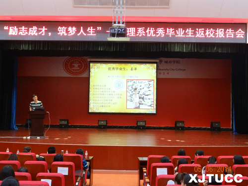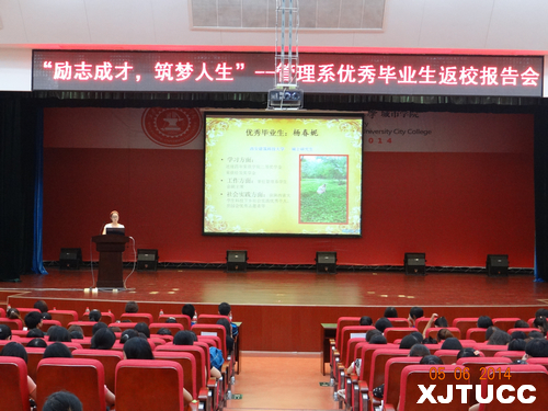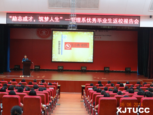 6月5日晚7点,"励志成才,筑梦人生"--西安交大城市学院管理系优秀毕业生返校报告会在教二报告厅如期举行。出席本次报告会的领导及老师有:管理系常务副主任冀祥、副主任王小青、学生工作主管刘健、团工委朱艳丽以及学工办其他老师。2010级优秀毕业生和2011级部分学生参加,报告会由教改管303班曹梦泉同学主持。