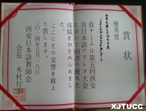 5月18日,我院外语系日语专业李欢、康佳妮、杨萌等10名选手在吴夫迎、吐雅老师的指导下,历时一个多月的刻苦训练,最终在"第五届西安市日语配音大赛"中取得了优秀奖的好成绩。