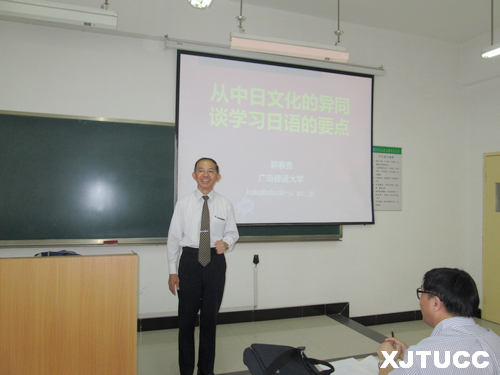5月28日下午,西安交大城市学院外语系在教学楼C416教室开展了主题为"从中日文化的异同谈学习日语的要点"的讲座,本次讲座邀请到日本广岛修道大学的郭春贵教授作为主讲人。讲座主要围绕中日文化的异同与学习日语的要点展开,讲座由外语系日语专业首席教授李国栋教授主持。参加本次讲座的有原外语系日语专业首席教授顾明耀教授、郭春贵教授夫人、日语教研室吴夫迎、吐雅、樊华老师及全体日语专业学生。