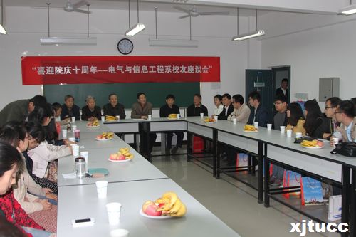 时逢西安交通大学城市学院十周年华诞,5月10日上午11时,电气与信息工程系于实验楼303室召开了校友座谈会。系主任赵录怀出席并主持了此次座谈会,与会嘉宾还有电信系副主任王世文、学院教授会主席申忠如、电气专业首席教授廖培金、测控专首席教授杨栓科等多位资深教授以及全系其他教职工。