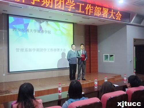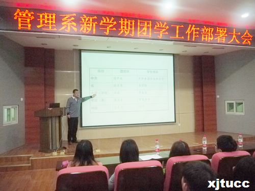 2014年4月3日中午12时,管理系在F100隆重举行新学期团学工作部署大会。管理系常务副主任冀祥、学生工作主管曹嘉伟、团工委书记朱艳丽以及学工办刘健、王亮、蔡婷、李玉婷、冯欣等老师出席了大会,大会由潘璞同学主持。