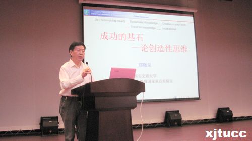 郑晓泉教授分别从“创造性思维的物质基础”、“社交礼仪与个人修养”、“激发个人潜能”及“情商管理”等四个方面并结合个人丰富的人生阅历阐述了创造性思维在个人发展中所起的重要作用。郑教授首先从生活中的创造性思维、速度、水的来源、空气与绝缘气体、界面与界限等物质世界谈起,告诉同学们要善于提问题,要善于激发自己的想象力;其次,郑教授以自己的知青经历、做工人经历等丰富的个人阅历和对生活、对人生以及对社会的看法,用幽默的语言深入浅出的告诉同学们要不断培养自己的社会能力、学习能力,同时还要学会社交艺术、培养宽大胸怀,要有大思维、大境界;培养起健全的人格,做高尚的人。郑教授还从如何获得高水平情商结合自己的经历谈了个人体会和想法。