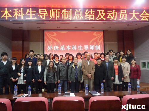 为总结导师制在外语系顺利实施后的成果, 改进与完善导师制度,使其更有利于因材施教、培养出具有个性的杰出人才,外语系本科生导师制总结及再动员大会于2014年19日下午2:00在F100顺利召开。出席本次大会的嘉宾有外语系主任白永权,外语系副主任赵永生,外语系副主任韩红建,以及大学英语和各专业课老师。