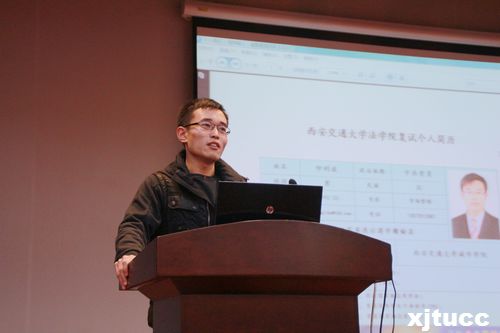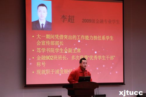 随后,09级优秀毕业生仲立波(现就读于西安交通大学法学院)与大家分享了他的大学生活,人生规划以及他对大学生活的看法,鼓励在场的每个学生找准自己的方向,明确目标,朝着既定目标一步步地迈进。紧接着09级学生李超(现就职于浦发银行)与大家分享了他的求职经验,并且对现在就业形势的进行了分析,使大家明白了在大学里应该武装好自己。