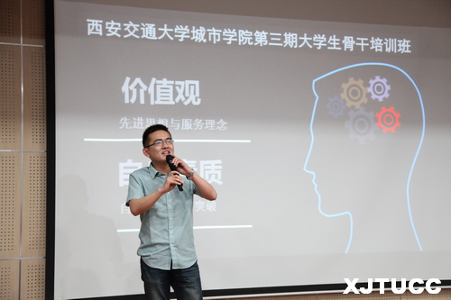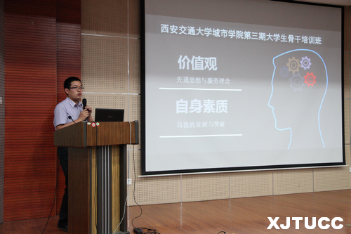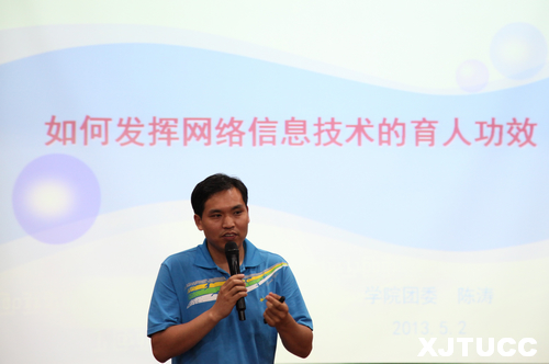 2013年5月2日晚,西安交大城市学院第三期大学生骨干培训班第二讲在学院教学楼F100举行。学院团委书记陈涛老,08级优秀毕业生代表、省第六期大骨班标兵学员郭智超校友,09级优秀学生干部代表、院学生会主席张勤川同学出席并分享各自的学生干部经历和认知。