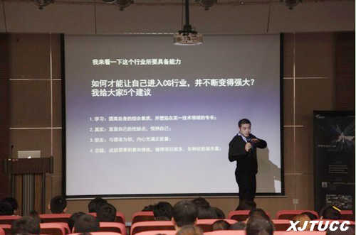战杨老师围绕可视化设计在CG行业中如何应用、CG行业主流技术的运用与制作流程、水晶石技法技术分享与揭秘以及可视化设计在CG领域中的发展前景等几个主题进行讲解,与大家交流行业中的最新息与如何展开专业学习的方法,并且勉励同学们对于专业学习要“坚持不懈,直到成功”。