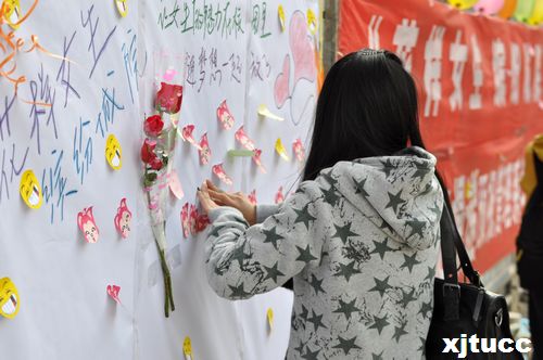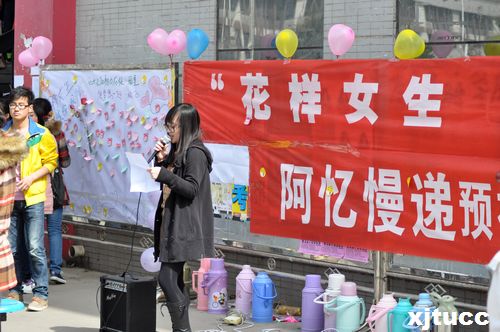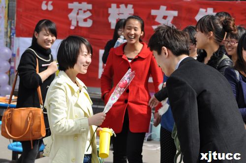 活动在管理系学生会全体干部的精心筹备下有序开展,共分为三个部分:一,邀请管理系辅导员和全院女生拍摄主题为“我心中最美的女生” 的视频,于3月7日中午在学生食堂二楼播放。二,制作“幸福留言板”,邀请全院女生在节日当天贴下自己许下的心愿,传递温暖与幸福。三,活动的高潮部分由帅气的男生为当天穿着“幸运色”——暖黄色衣服的女生献上一朵娇美的玫瑰及一张精美的明信片,送出节日的祝福。精美的展板,温馨的场面让广大女生感受到了作为女生的骄傲与自豪。