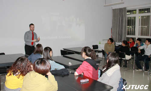 来访期间,Jake同外语系、经济系、管理系及机械系的老师们进行了亲切会谈,双方就中美文化、出国留学及学术研究等事宜展开了一系列讨论。同时也和即将出国的中美项目办学生进行了见面,为他们答疑解惑,帮助大家做好2013年秋季出国申请。最后,Jake为同学们做了一场精彩的讲座,介绍了美国最流行的橄榄球运动以及UNL在全美排名数一数二的Huskers橄榄球队,场面别开生动。