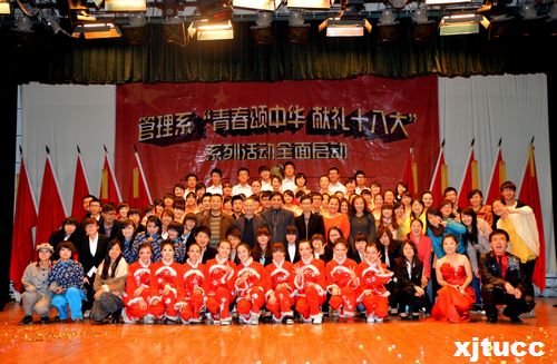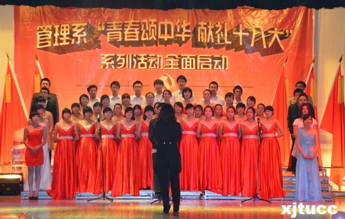 11月12日,正值十八大召开之际,西安交通大学城市学院管理系以“青春颂中华,献礼十八大”为主题的第二届红歌赛在大学生活动中心华丽上演。莅临本次红歌赛的领导及嘉宾的有:学院工会主席、管理系首席教授王海民老师,管理系副主任冀祥老师,院团委书记陈涛老师、管理系办公室主任成琳老师,院团委王瑶老师,应用经济系学生工作负责人王飞老师,管理系学生工作负责人曹嘉伟老师,计算机系刘敏涛老师,艺术系李成老师,管理系团工委书记刘健老师及管理系的各位老师们。比赛由万翔和贺惠梓同学主持。