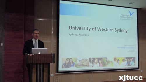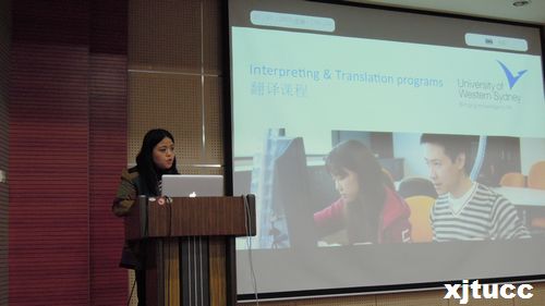 2012年10月24日早10点30分,外语系在F100举办赴澳留学项目介绍会。西悉尼大学的Peter Hutchings教授和Jing Han教授,西安交通大学外国语学院聂文信教授,外语系副主任赵永生老师,外语系徐素云老师,系学工负责人蒋芳芳老师出席了此次介绍会。