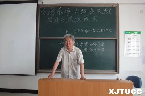 6月7日8:30,西安交大城市学院电信系09、10级教改班的同学齐聚在D309教室进行学习交流座谈会,出席座谈会的有电信系电气专业首席教授廖培金、电信系团工委书记吴昊翔以及电信系辅导员巩婷。