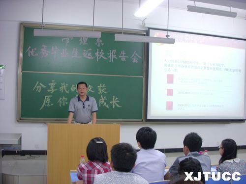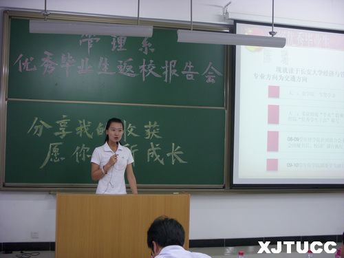 为进一步提高学生学习的积极性,以更好的姿态面临即将到来的期末考试,西安交通大学城市学院管理系团工委于6月5日晚19:00在教2-405教室举办了“分享我的收获,愿你有所成长”为主题的第三届优秀毕业生返校报告会。管理系副主任冀祥老师、学工办负责人曹嘉伟老师、代团工委书记刘健老师以及管理系的各位辅导员老师们共同出席了本次报告会。报告会邀请到了管理系07级的陈璐、郑永利和高娟三位优秀毕业生,另外还邀请了两位08级即将毕业的李瑶和刘超同学。