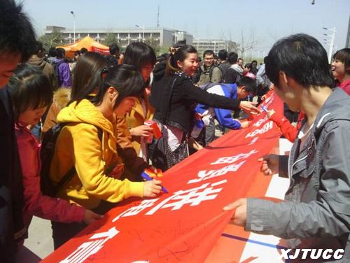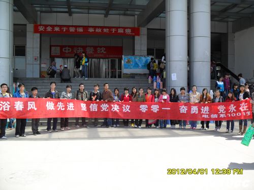 为了使我校学生更多的了解党的基本理论知识,让更多的同学能在思想上与时俱进,4月1日中午,电信系1001党支部在食堂一楼门前进行了党的知识宣传活动。党员们把印有党的理论知识的卡片热情地分发给路过的同学。他们的笑容感染了很多人,很多同学都积极踊跃地参与其中,并且在横幅上签名表示支持。卡片虽小,却让同学们了解了很多党的理论知识,与党的距离更近了一步。
