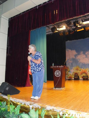 Anne Bliss教授围绕着"Cowboys, Cowgirls, Native Americans and Other Famous American Characters" and a "sing along" in English的主题,首先从西部牛仔讲起,对美国的风土人情、历史文化做了详尽的介绍。接着,一幅幅带有异域风采的画面将大家带入了不同寻常的意境之中,在大家被Anne Bliss教授轻松愉悦的授课风格所吸引的同时,她还不忘从最基本的发音入手帮助同学们纠正语音语调。讲座期间,Anne Bliss教授与大家频繁互动,妙趣横生,引来同学们阵阵的掌声和欢呼声。最后,一首经典的西部牛仔之歌将本场讲座画上了圆满的句号。