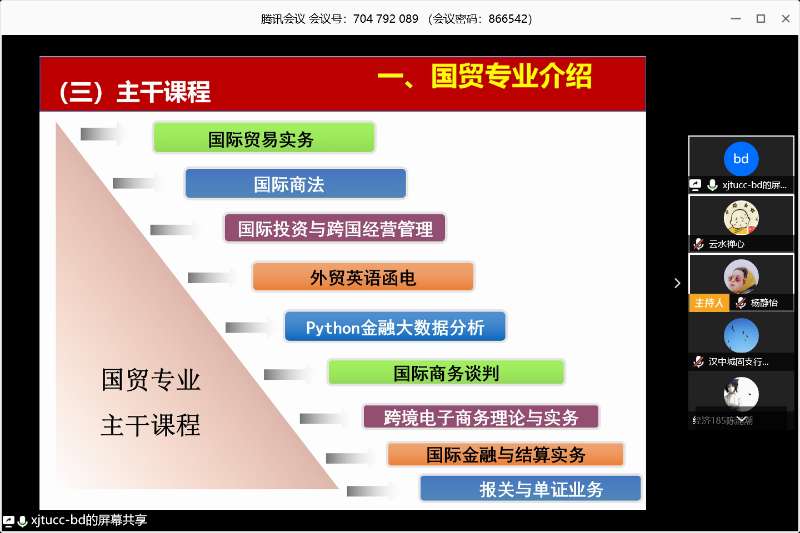 本次腾讯会议持续一小时,系主任助理张美丽首先就18级专业分流办法简要介绍,使同学们对专业分流有了基本的认识,随后国贸专业负责人白丹、金融专业负责人张美丽、财政专业负责人张娜、经统专业负责人李茂盛分别从本专业的培养目标、专业优势、主干课程、就业方向等方面做了详尽的介绍。
